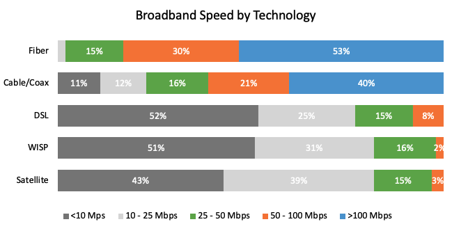 When we consider the Internet options that are available, the only two options that are clearly in the ballpark of the proposed 100/20 Mbps are fiber and cable/coax. Based on the Connected Intelligence Broadband America State Report, which sourced millions of speed tests, we can see that DSL, Wireless ISP and Satellite all struggle to achieve more than 100 Mbps speeds. And that leaves 5G to the home which is, well, complicated, as it depends on factors such as the population served by the cell tower, the back haul capacity and, most importantly, the frequency of spectrum used for the 5G solution. While 5G is often cited as offering 500Mbps or greater potential, the reality is that most, if not all, rural 5G deployments will use mid-band (or low-band) spectrum that is unlikely to surpass 100 Mbps when you consider all of these factors.