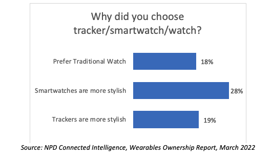 Now, there’s a key difference between the watch purchase and the old days of pre-pubescent phones: the watch is not a device purchased in isolation. It, obviously, has to work in harmony with your phone and the rest of your technology-driven ecosystem. That means that the customer is far more likely to buy a watch from the same brand as their smartphone (particularly for the big two smartphone OEMs). But even there, it’s not a sure thing: 25% of iPhone customers who buy a watch purchase a smartwatch outside of Apple’s ecosystem, for example, according to the Connected Intelligence Wearables Ownership Report (March 2022).