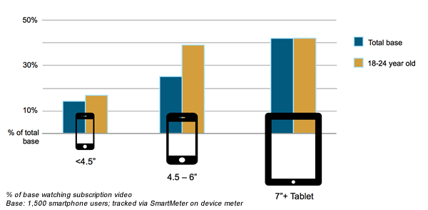 And size does matters and impacts the adoption of subscription video. Once the screen size is greater than 4.5 inches, adoption increases, and the bigger the screen, the greater the adoption, scaling up to the tablet-sized 7 inch screen. And if we look at a younger audience, adoption is boosted once again, with 4.5 to 6 inch screened smartphones commanding almost as many users as a tablet.