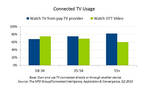 TV Everywhere goes well beyond a mobile app strategy; it’s about having a TV app strategy as well. And, that means understanding which devices consumers will be using to get apps on their TVs. The migration to using apps instead of linear, on-demand, and DVR pay TV programming is already underway, and it’s most prominent with consumers age 18-34. In the chart below, over-the-top (OTT) video is not just Netflix and YouTube viewing, it’s network apps such as HBOGO too. These apps often offer a different viewing experience, one we’re finding is very attractive to consumers as it can open up a network’s full library of TV shows, line-up of moves, additional and exclusive footage, etc.