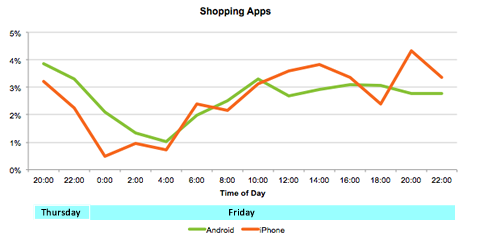 An analysis of the time of day activity shows a significant drop in activity during the peak shopping period of midnight to 4AM. This suggests that the pricing tools are used less by the hardcore shoppers who lined up. These shoppers typically already know what they are looking for, based on the well-publicized deals. However, once the initial grab-and-buy period slows, the smartphones come out to support a more paced shopping experience.