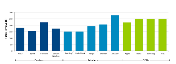 And the manufacturers are grasping the trade-in opportunity too. For a smartphone manufacturer, a trade-in option can provide an incentive for a consumer to switch loyalty from a competitor’s device to theirs. Notably, nearly all manufacturers offer a premium price to consumers who trade-up from a competitive brand. Take the chart below, which provides a snapshot of trade-in prices offered for an Apple iPhone 4S 16GB (AT&T version). Nokia, Samsung and HTC all offer above-average trade-in values, as long as the new device is (of course) that OEM’s device.