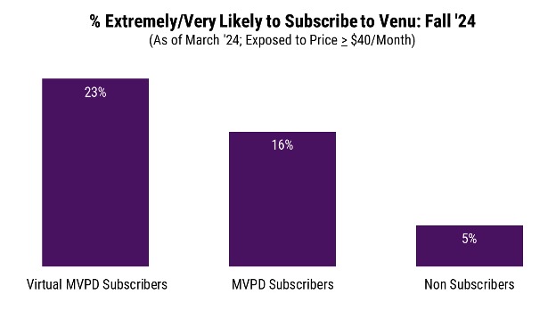 Despite its cord cutter focus, Venu actually has the greatest appeal among virtual MVPD subscribers, according to Circana’s 2024 TV Switching Study, with nearly one-quarter (23%) of those consumers reporting they are extremely or very likely to subscribe this fall. I expect reality to be significantly different from intent, however, and expect that actual adoption by virtual MVPD subscribers to be far lower since Venu has fewer sports rights than other virtual MVPDs.